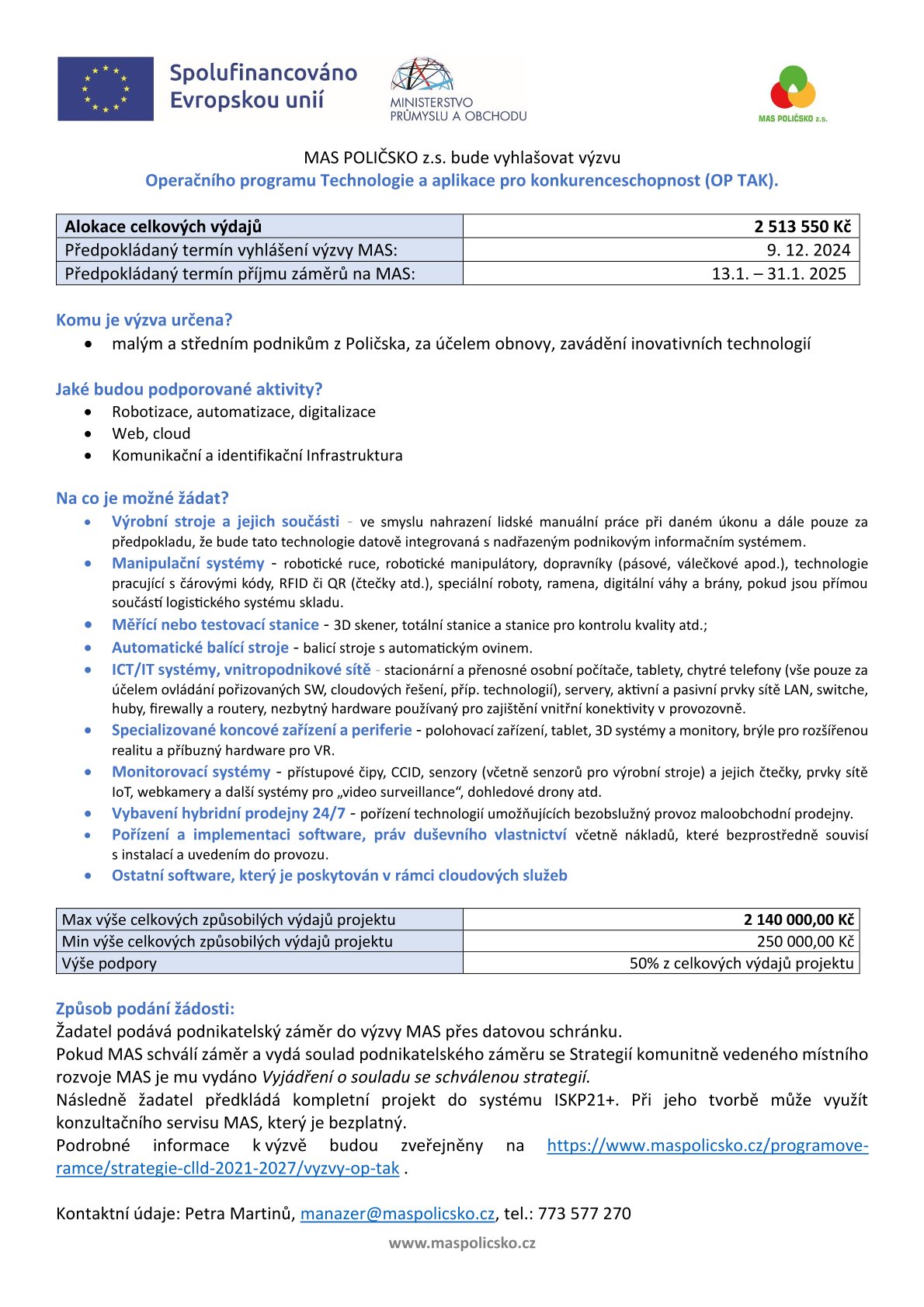 Dne 25.2.2025 byla vyhlášená Výzva MAS POLIČSKO 3/2025 SP SZP. Příjem žádostí je od 10.3.2025 do 7.4.2025. Školení pro žadatele se uskuteční 7.3.2025 v konferenčním sále Multifunkčního domu, nám. Na podkově 68, Bystré. Svoji účast prosím potvrďte na Tato e-mailová adresa je chráněna před spamboty. Pro její zobrazení musíte mít povolen Javascript.. Pozvánku naleznete ZDE: